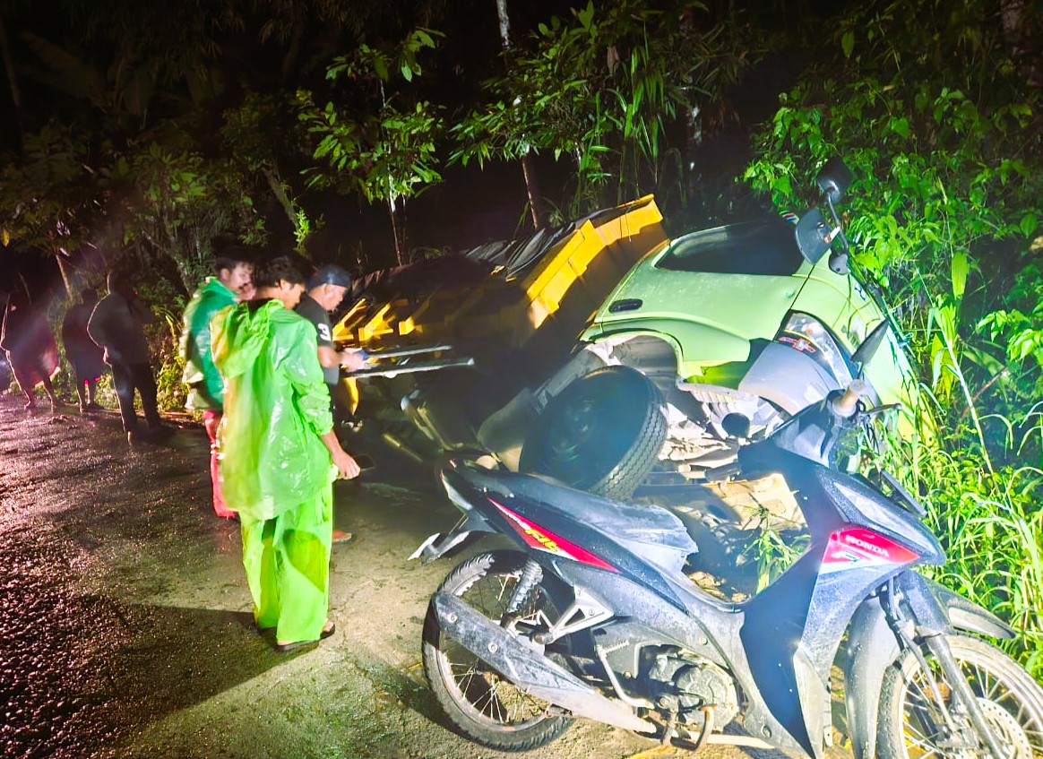 Namun, kondisi jalan yang sempit dan licin akibat hujan menyebabkan bahu jalan amblas, sehingga truk kehilangan keseimbangan dan terguling ke dalam parit.